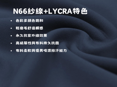 N66(尼龍66)是一種強韌且耐磨的合成纖維,具有良好的彈性與耐用度,搭配萊卡纖維後,能進一步提升布料的伸縮性與回彈能力。